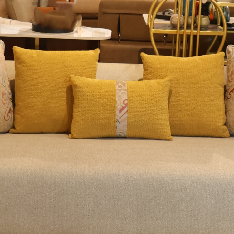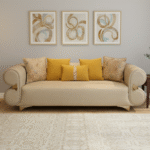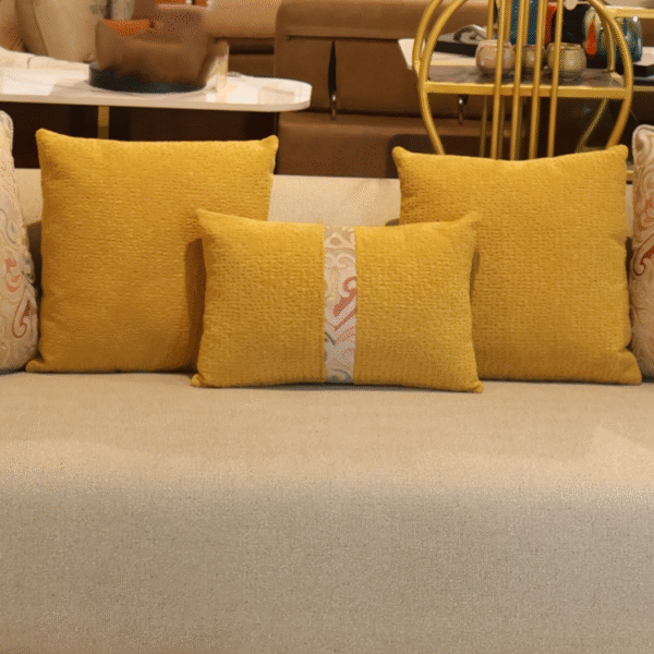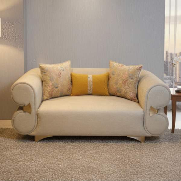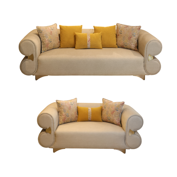 Aristo Sofa blends classic charm with modern elegance, featuring rolled gold-accented arms and plush beige upholstery. Includes vibrant yellow and printed cushions. Available in 2-seater and 3-seater formats.