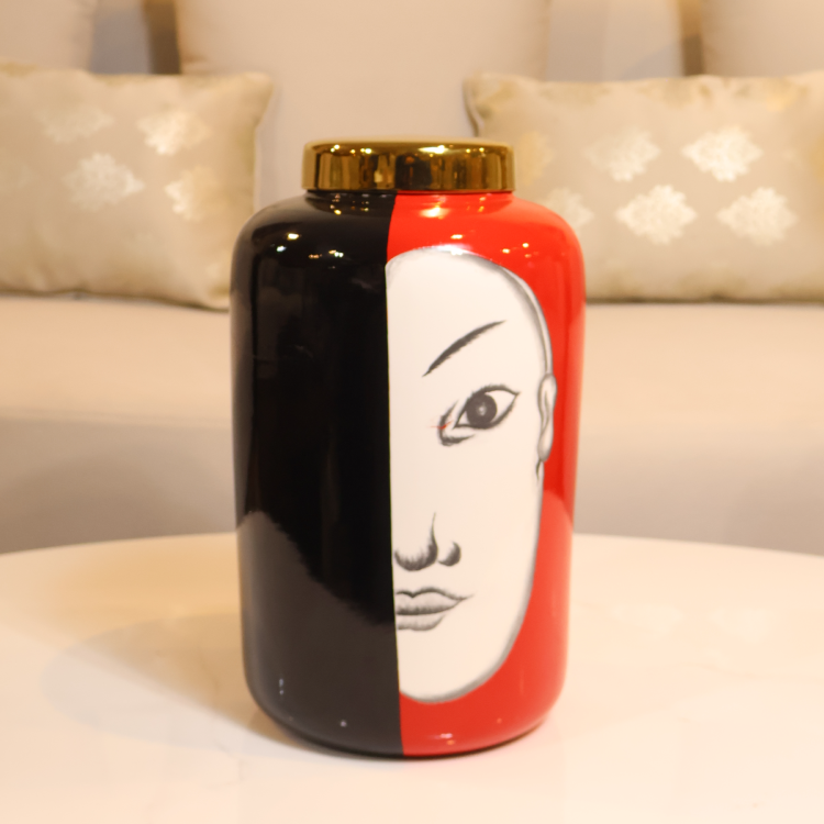 The Art Fusion Jar is a striking decorative piece featuring a bold red and black color palette with a hand-illustrated artistic face design. Its glossy finish and gold-toned lid add a touch of elegance, making it a perfect statement accent for modern interiors.