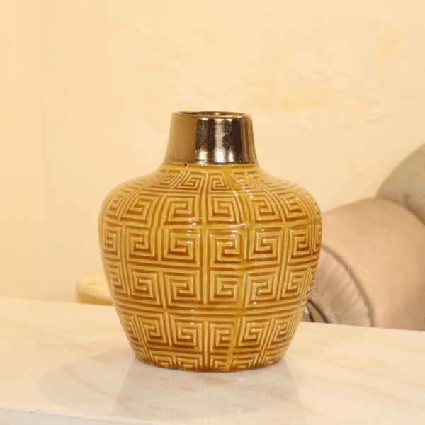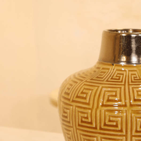 Aurelian Key Vase features a golden-brown body etched with a classic Greek key motif and a metallic gold neck. Its sculptural elegance adds timeless charm to consoles, shelves, or curated decor arrangements.