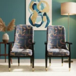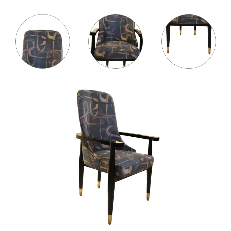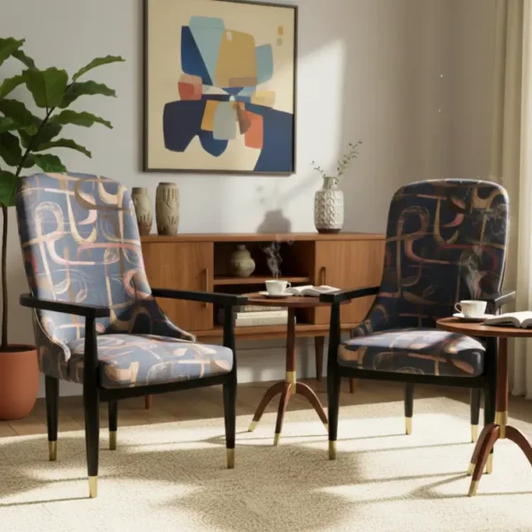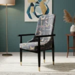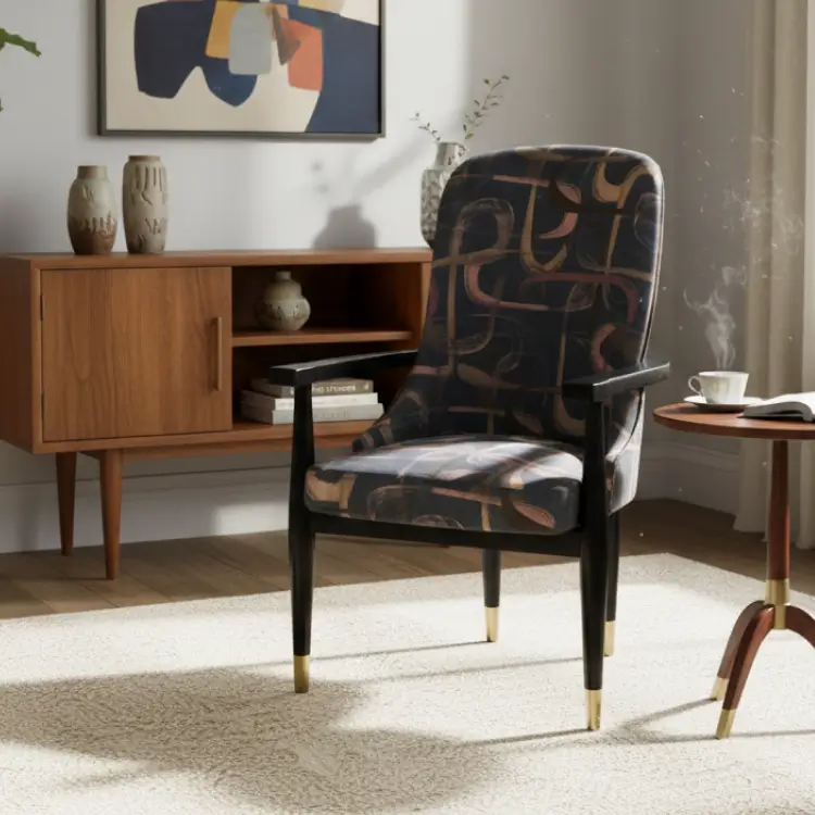 Aurora Accent Chair features a bold abstract fabric in soft pink, beige, and blue tones. With gold-tipped wooden arms and legs, it adds artistic flair and refined comfort to any contemporary interior.