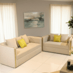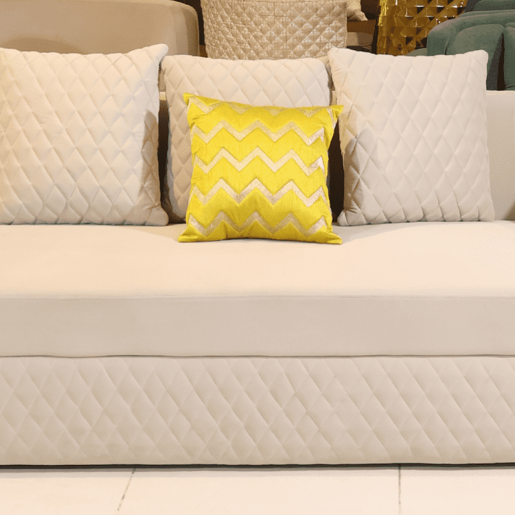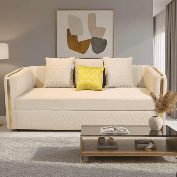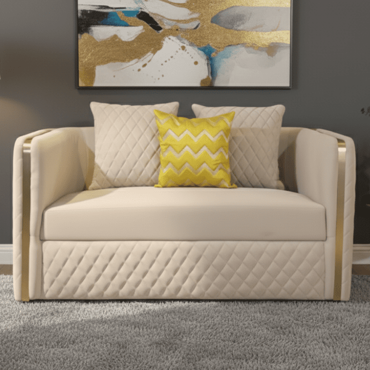 The Aurora Crest Sofa radiates refined charm with quilted cream upholstery, golden arm accents, and plush cushions. A bold yellow pillow adds a pop of personality, perfect for luxe interiors with a modern twist.