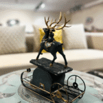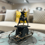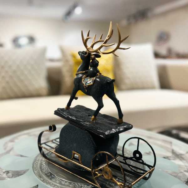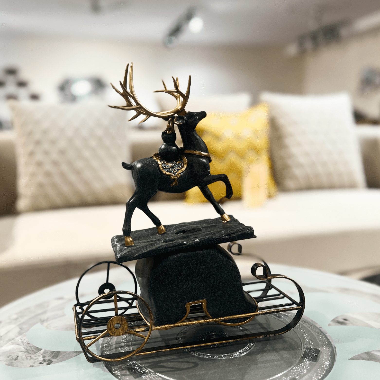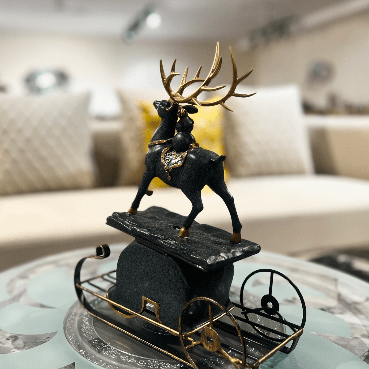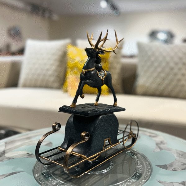 Black Sleigh Deer is a decorative sculpture featuring a black reindeer with golden antlers, jeweled saddle, and ornate sleigh base. A refined centerpiece that blends festive spirit with luxurious craftsmanship for elegant interiors.