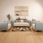 Blue Beige Bliss blends soft tones and plush comfort in a refined sofa set. With elegant armchairs, geometric mirrors, and swirl-patterned rug, it creates a serene, stylish centerpiece for modern living spaces. Available in 2-seater, 3-seater, and full set options.