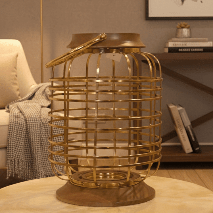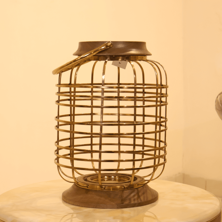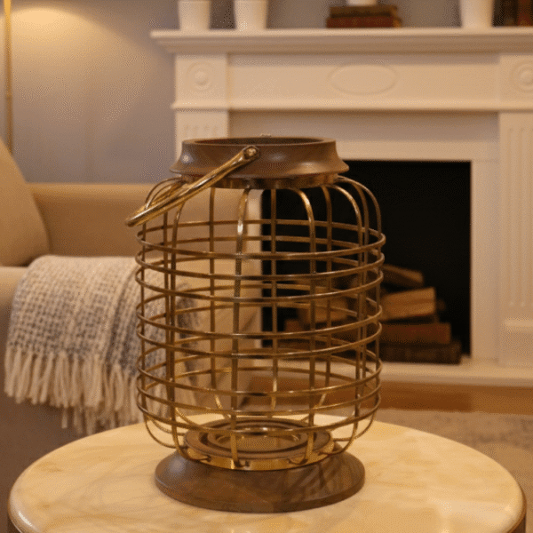 The Brasswood Glow Lantern features a brass wire cage with wooden top and base. Set on marble, it radiates cozy charm—perfect for warm-toned interiors with layered textures and relaxed, fireside ambiance.