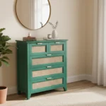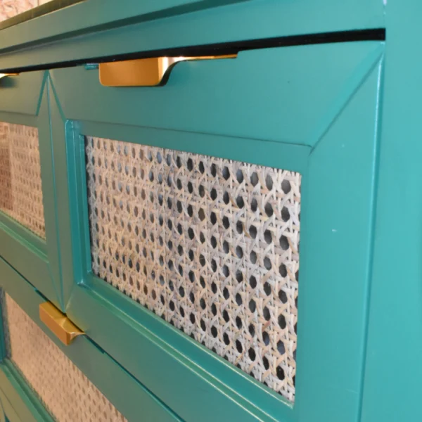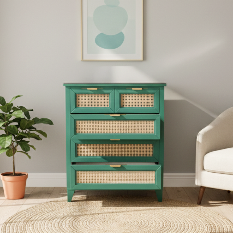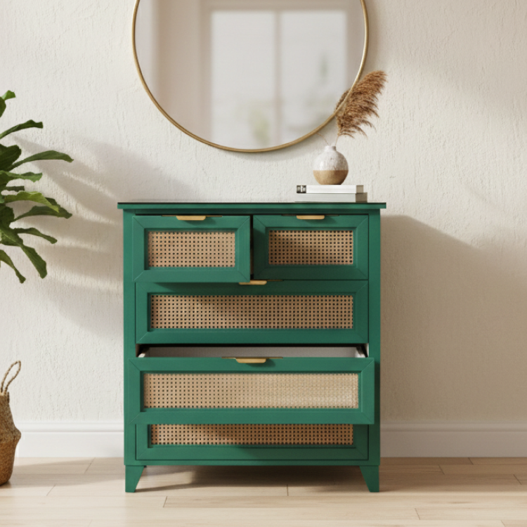 Blending natural texture with modern elegance, the Canaweave Dresser features rattan-front drawers, sleek gold handles, and a rich green finish. Its five-drawer design offers stylish storage for serene, light-filled interiors.