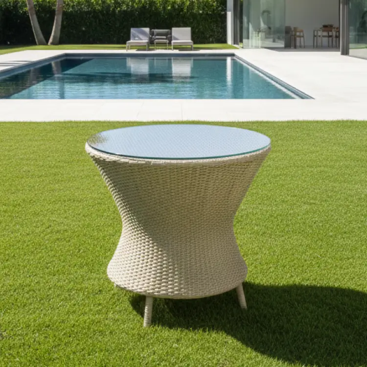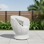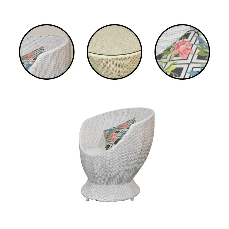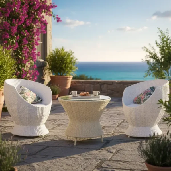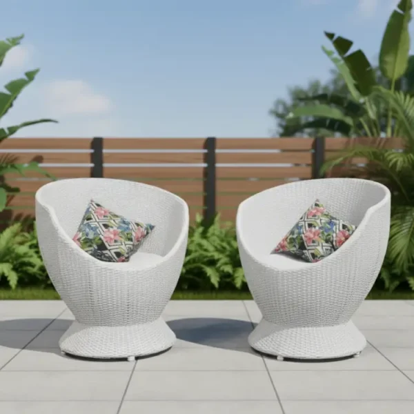 The Coastal Bloom Wicker Set includes white wicker chairs with floral cushions and a round table. Each chair costs ₹12,500, the table ₹13,000, and you can increase chair quantity to suit your outdoor seating needs.