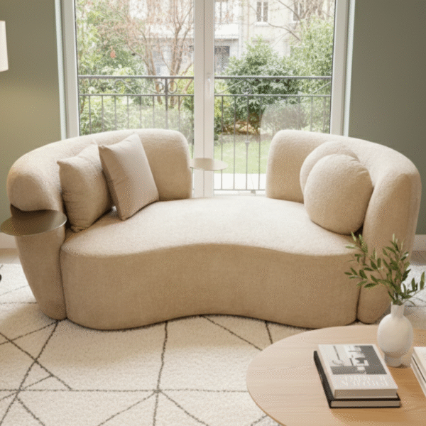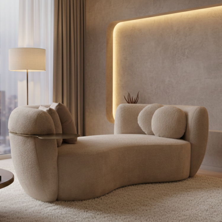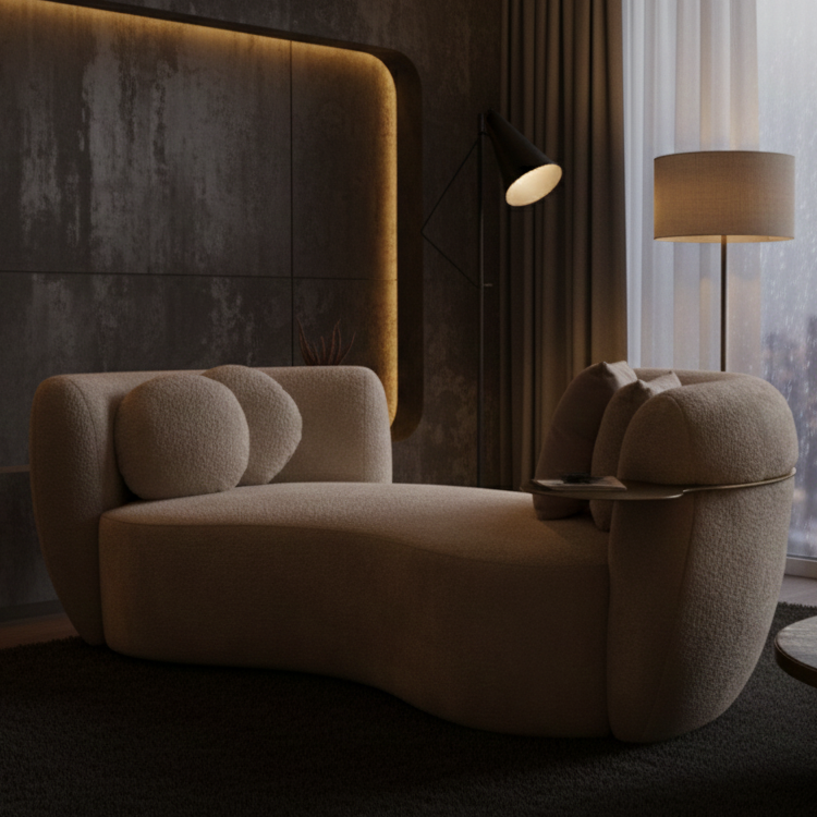 The Curva Luxe Sofa features a sculptural curved design in soft beige, paired with built-in side tables and plush cushions. It anchors contemporary spaces with elegance, comfort, and a view-enhancing silhouette.