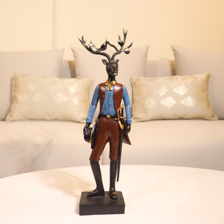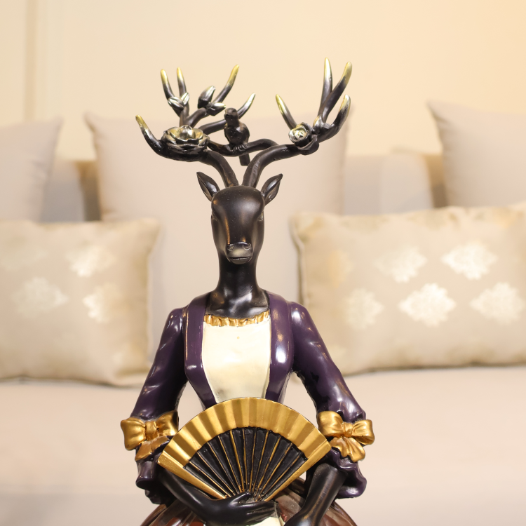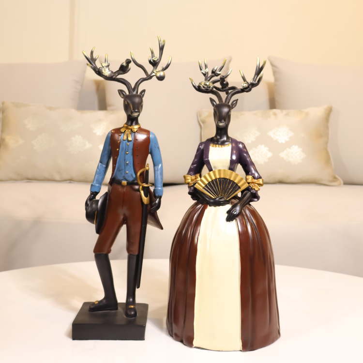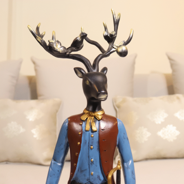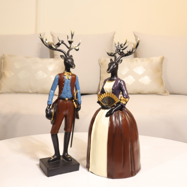 This elegant deer couple sculpture blends historical charm with whimsical detail. Dressed in vintage attire and adorned with birds on antlers, it’s a captivating decor piece that celebrates artistry, storytelling, and imaginative design.