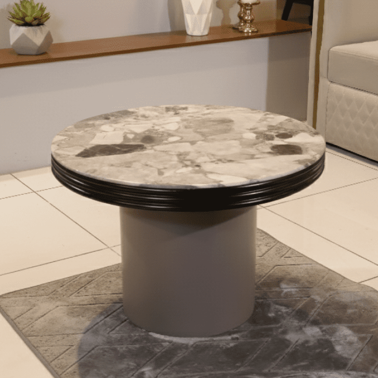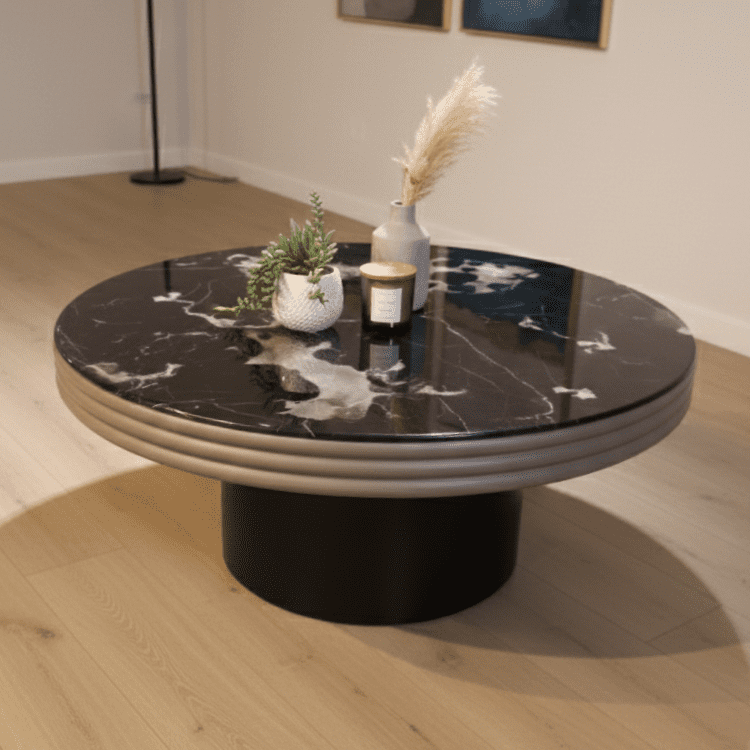 Dual Vein Coffee Tables pair black and white marble tops with sleek cylindrical bases. Their contrasting veining and modern form offer sculptural elegance and functional layering for contemporary living rooms or lounge setups.