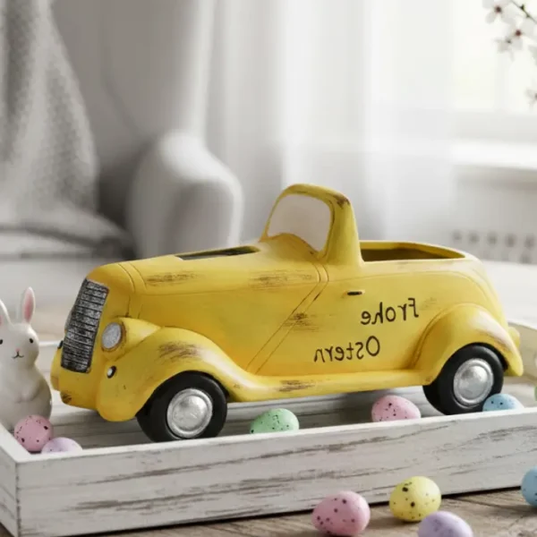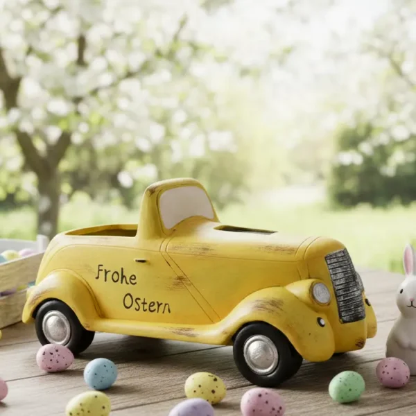 Easter Truck Decor. This adorable, distressed yellow vintage truck is perfect for your Easter table. Inscribed with “Frohe Ostern,” its open bed is ideal for holding eggs or sweet treats, bringing rustic, festive charm to any setting.