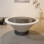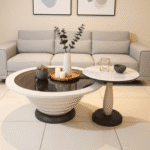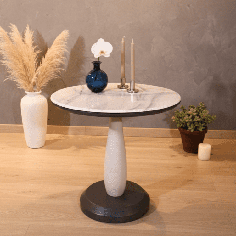 Eclipse Base Table Set pairs a ribbed white cone table with black glass top and a sleek marble pedestal side table. A sculptural duo that adds contrast, texture, and elegance to modern living spaces.