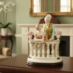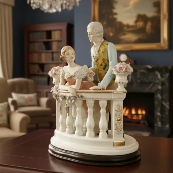 Capturing a timeless moment, this exquisite porcelain figurine features an elegantly dressed couple on a detailed floral balcony. A beautiful accent piece that brings a touch of classic, refined romance to any home decor.