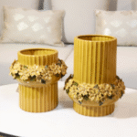 The Flower Ring Vase features a ribbed ceramic design in a warm yellow tone, beautifully accented with a ring of detailed floral motifs. Available in two sizes, it adds charm and elegance to any décor.