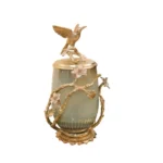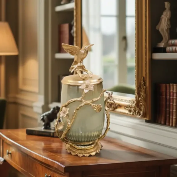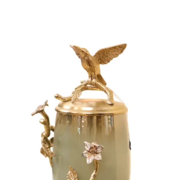 This elegant jar features a gradient green body, gold accents, and a sculpted bird perched atop. Wrapped in floral metalwork, it’s a luxurious blend of function and artistry — perfect for display or gifting.