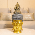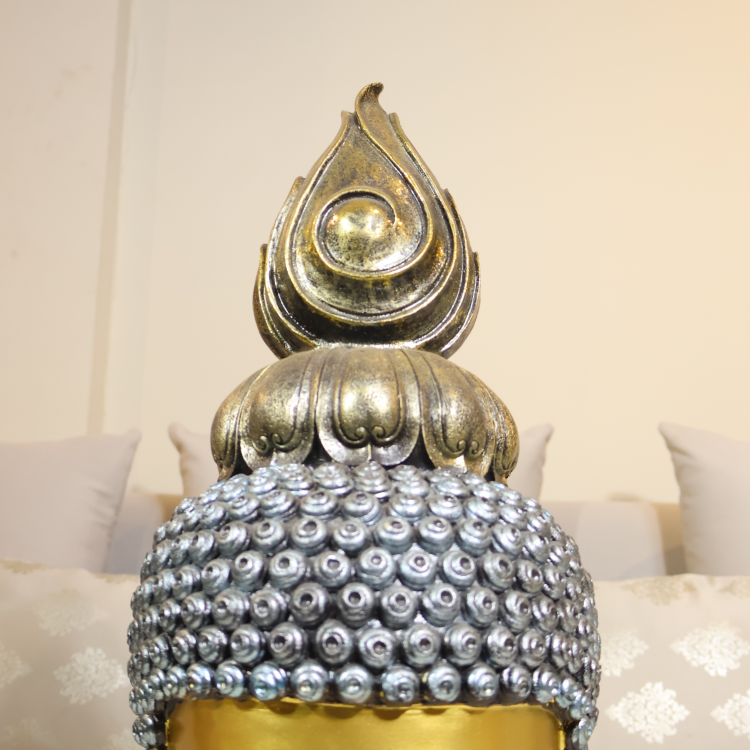 This elegant Golden Buddha Statue features intricate detailing, with a serene expression and a beautifully sculpted flame atop the head. A symbol of peace, wisdom, and spiritual harmony, it enhances any space.