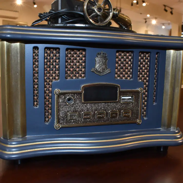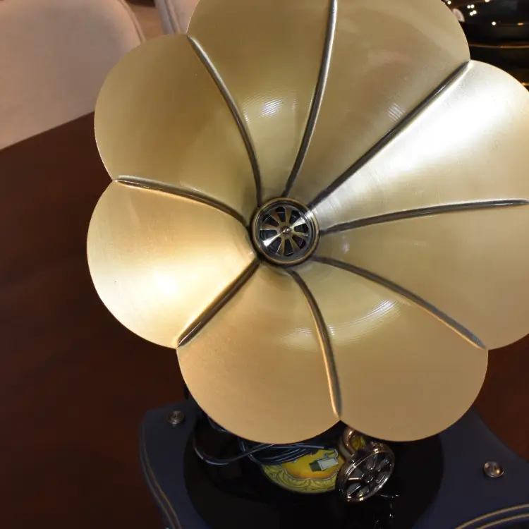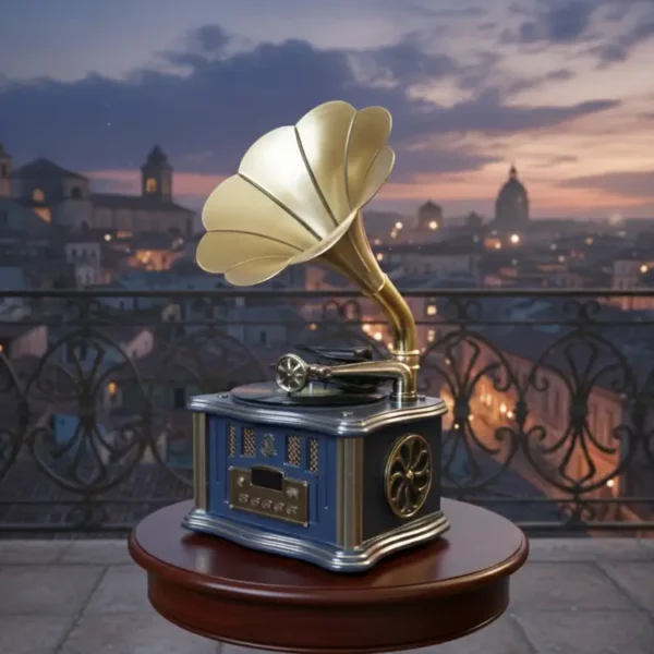 A nostalgic centerpiece with a golden horn and ornate base, this gramophone blends vintage charm with modern elegance. Perfect for cozy corners, it evokes timeless ambiance in studies, libraries, or refined living spaces