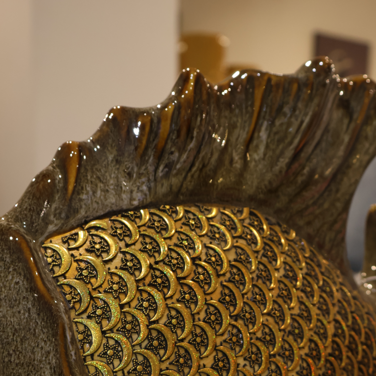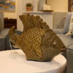The Golden Fin Accent Set features a ceramic fish with shimmering gold scales, paired with sculptural decor and greenery. This curated tabletop arrangement adds playful elegance and texture to modern, minimalist interiors.