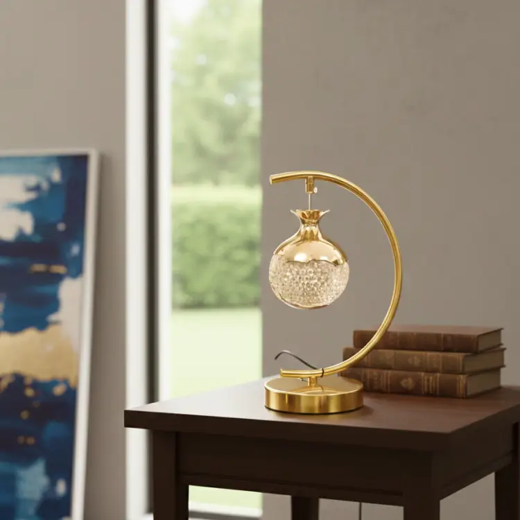 This artistic table lamp features a golden arc frame and a pomegranate-inspired pendant with crystal texture. Elegant and functional, it adds a luxurious glow and sculptural charm to desks, consoles, or bedside tables.