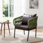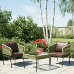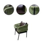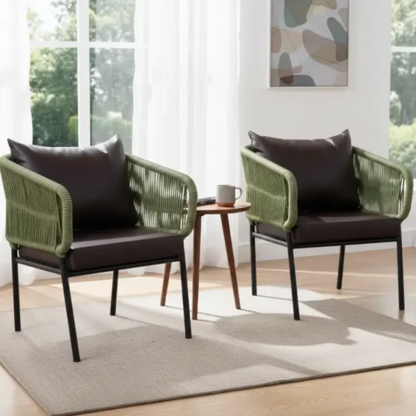 This stylish Green Outdoor Seating set features durable green rope-woven chairs with comfortable brown cushions and a matching glass-top table. Perfect for relaxing on your patio, balcony, or garden, providing a modern and cozy spot for conversation.
