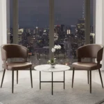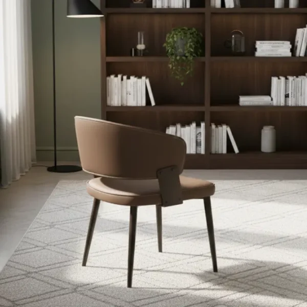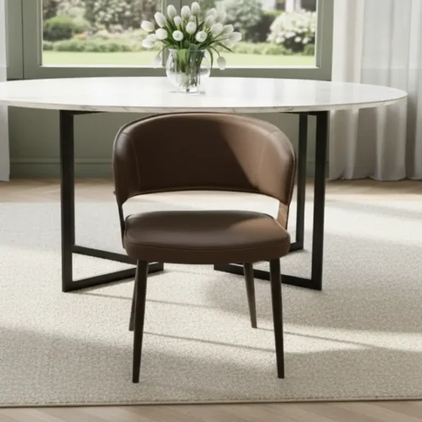 This sophisticated grey chair blends smooth leatherette with soft suede accents, supported by a sturdy black metal frame and teak wood legs. Its mixed-material design offers both comfort and contemporary elegance for any space