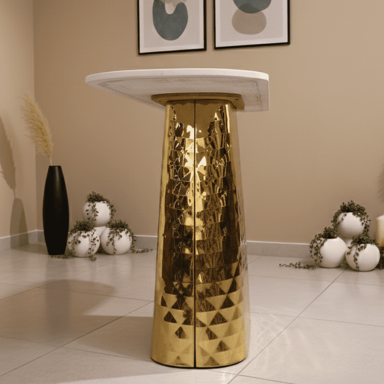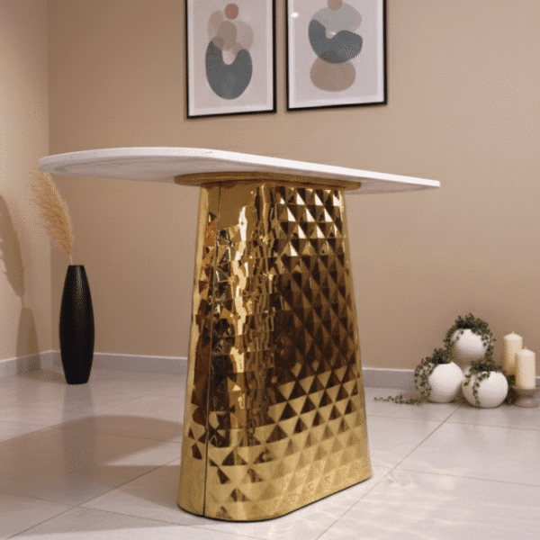 Halo Crest Console features a sleek marble-like top and sculptural gold base with textured detailing. Its asymmetrical silhouette adds luminous elegance to entryways, hallways, or curated living spaces with modern, gallery-inspired flair.
