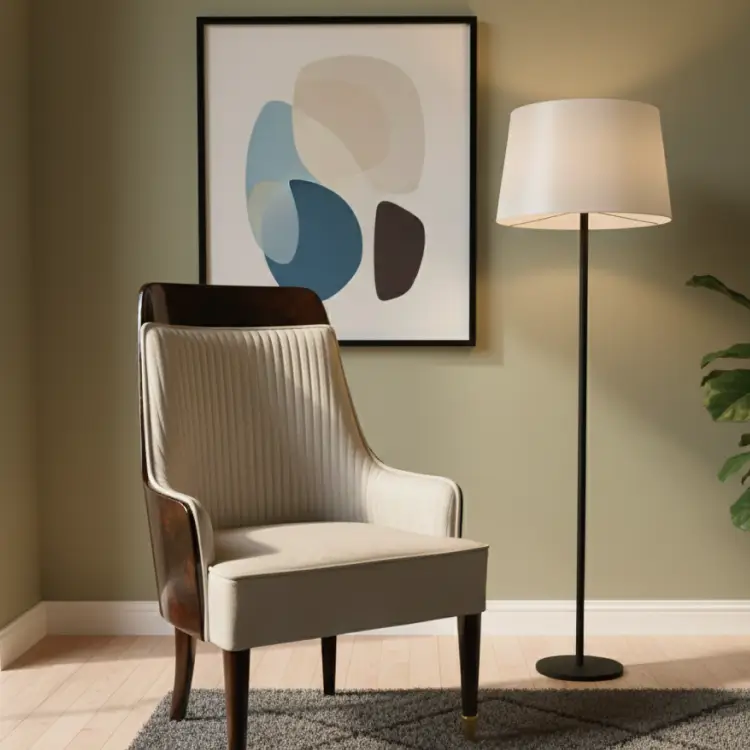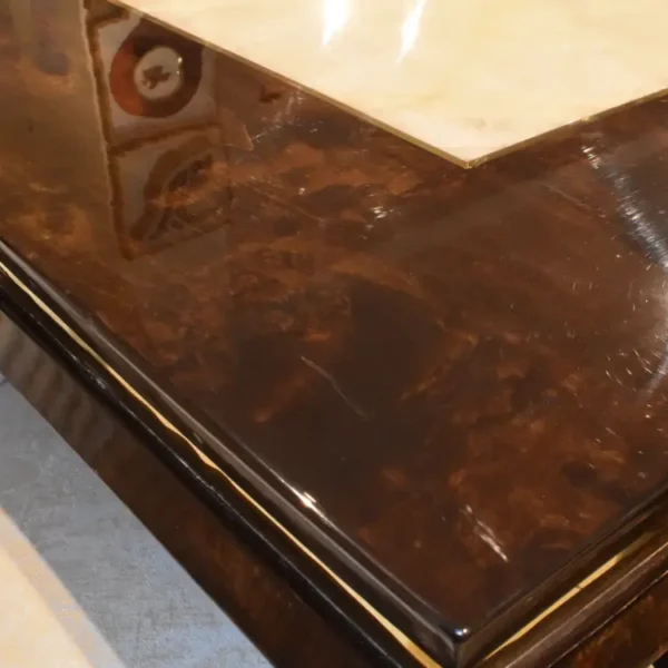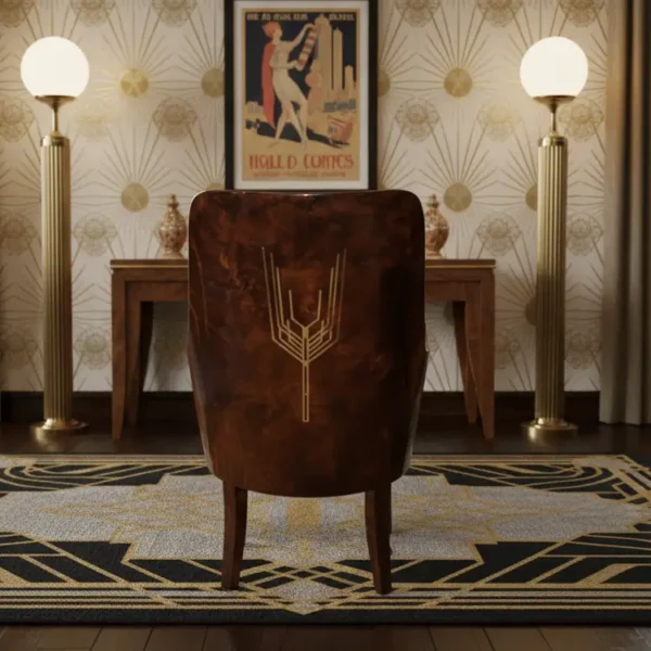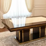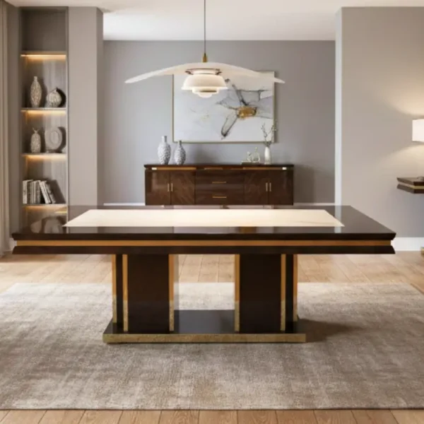 This six-seater dining set features a glossy wood table with a light inlay and sculptural chairs. Gold geometric accents and neutral upholstery elevate the look, blending modern elegance with timeless craftsmanship.