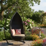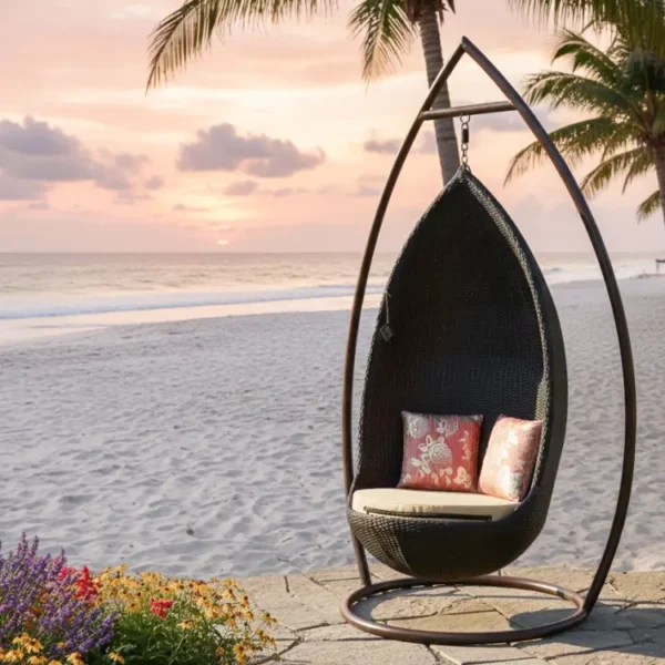 Enhance your outdoor area with this stylish KLODOR Swing with Stand. Features a sturdy iron frame and handwoven, UV-protected rattan basket. Comes with soft, water-resistant cushions, perfect for relaxing in your garden or patio.