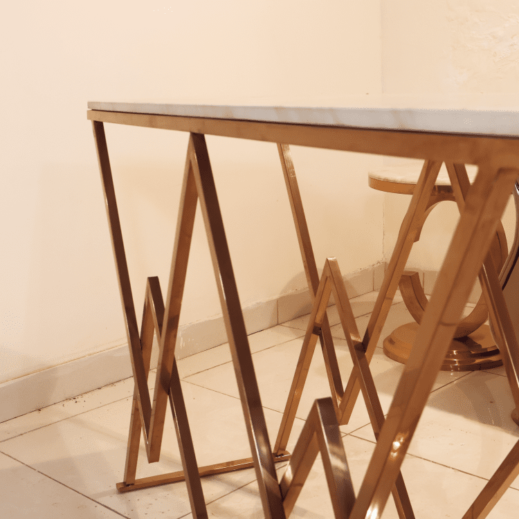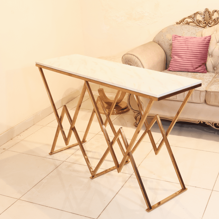 Marble Prism Console pairs a sleek white marble top with sculptural gold geometric legs. A refined accent for entryways or living rooms, it balances minimalism and luxury with space for curated decor arrangements.