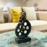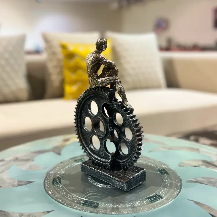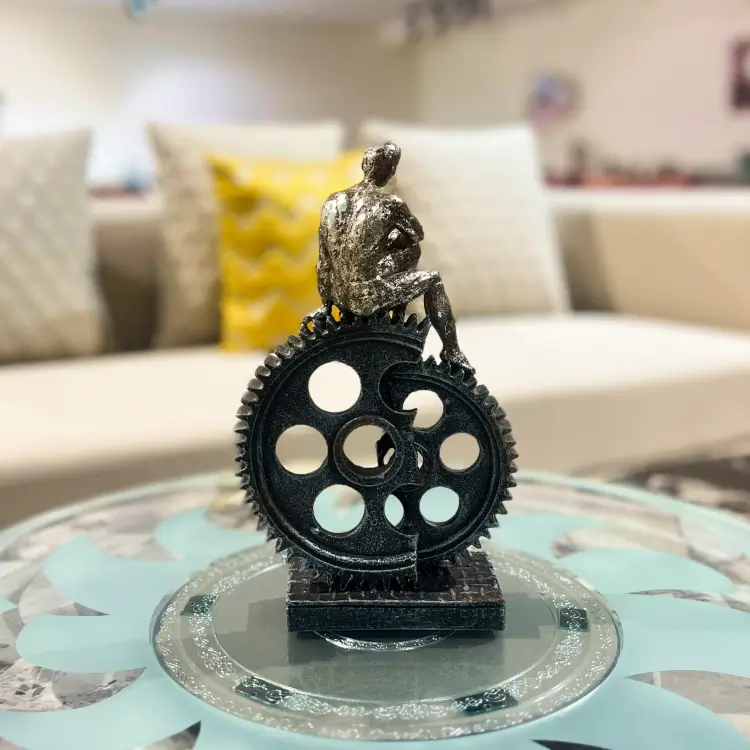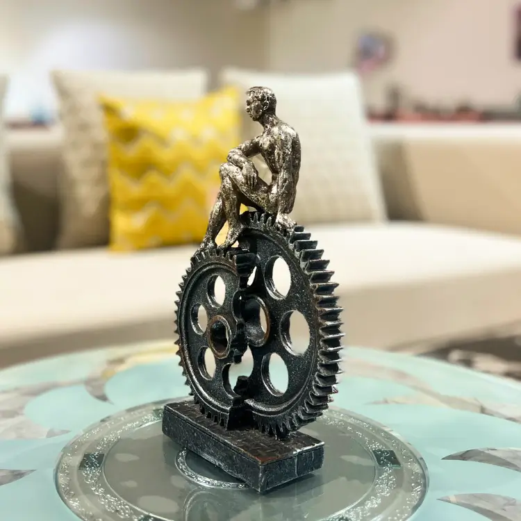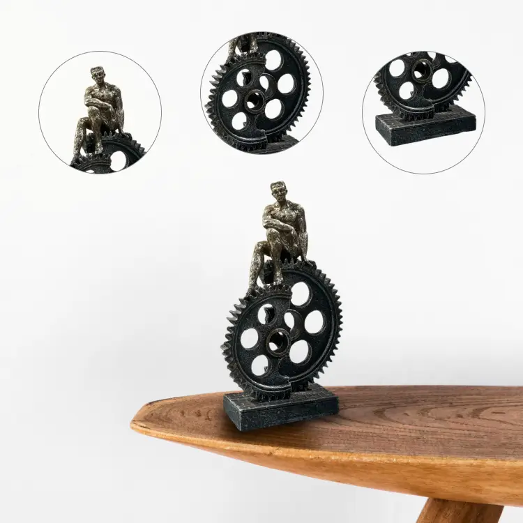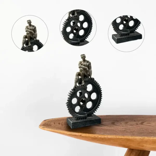 A contemplative figure sits atop interlocking gears, blending human thought with industrial design. Metallic tones and bold structure make this sculpture a standout piece for modern desks, shelves, or creative corners.