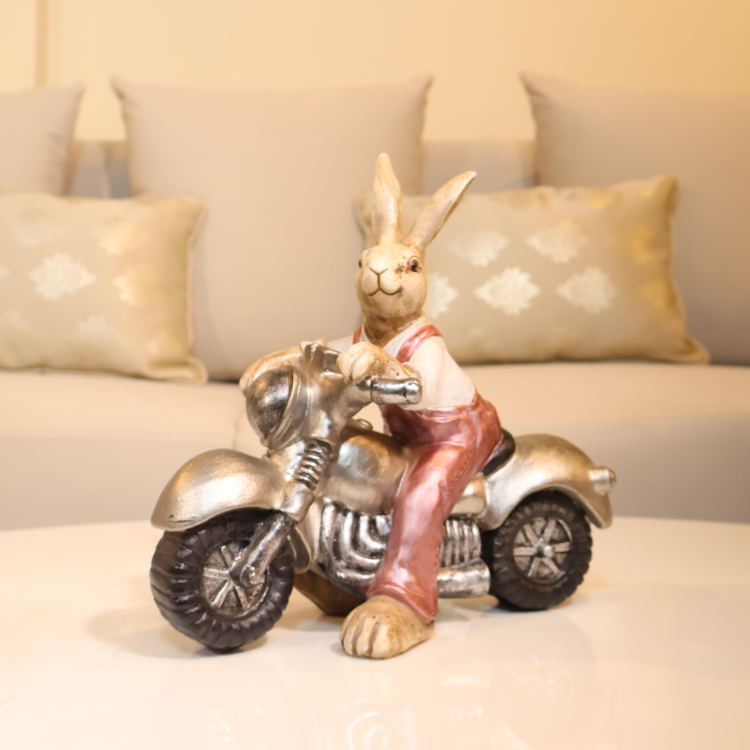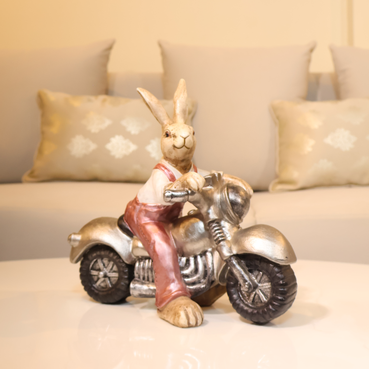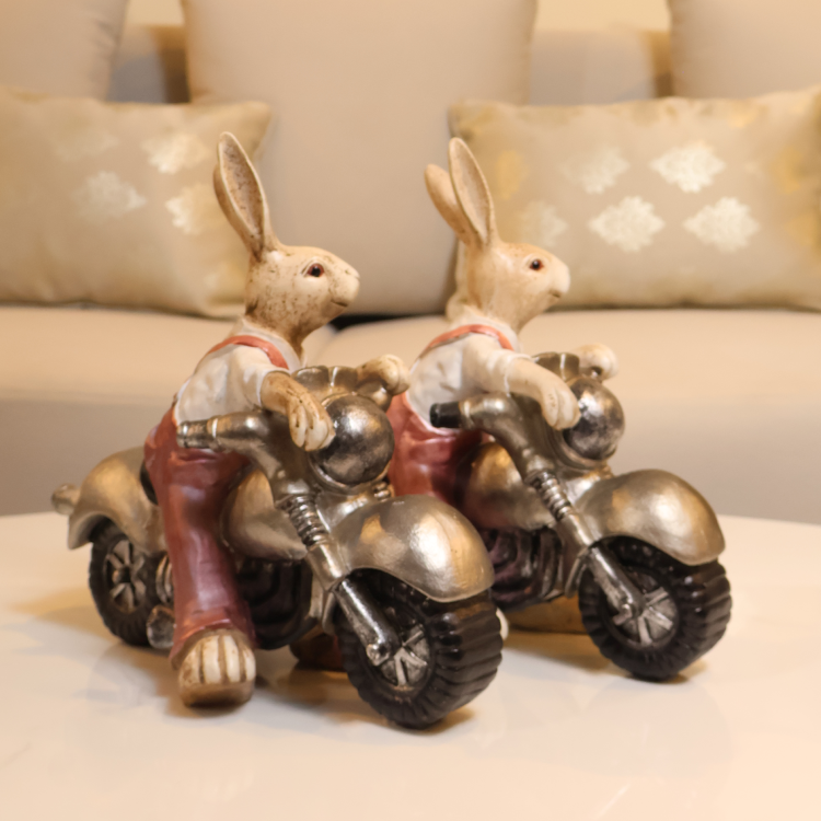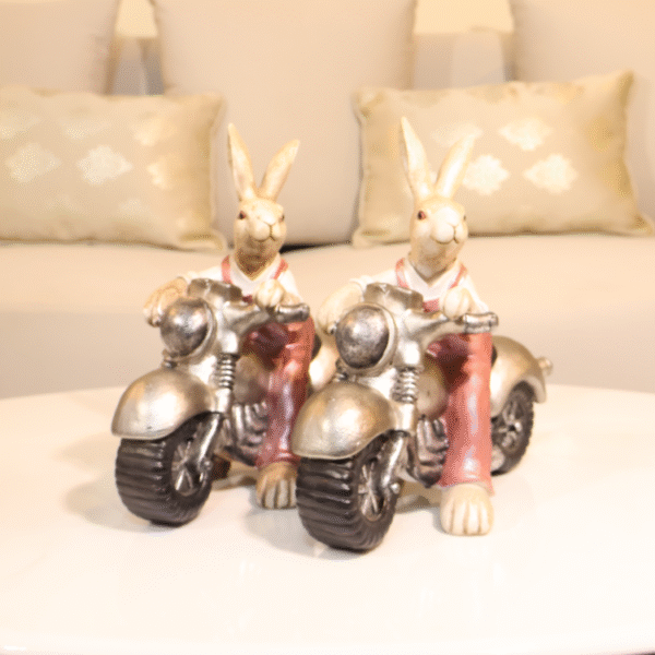 The Moto Hop Duo features playful rabbit riders in red and white attire atop metallic silver motorcycles. With detailed craftsmanship and quirky charm, they add a spirited touch to modern shelves and console displays.