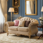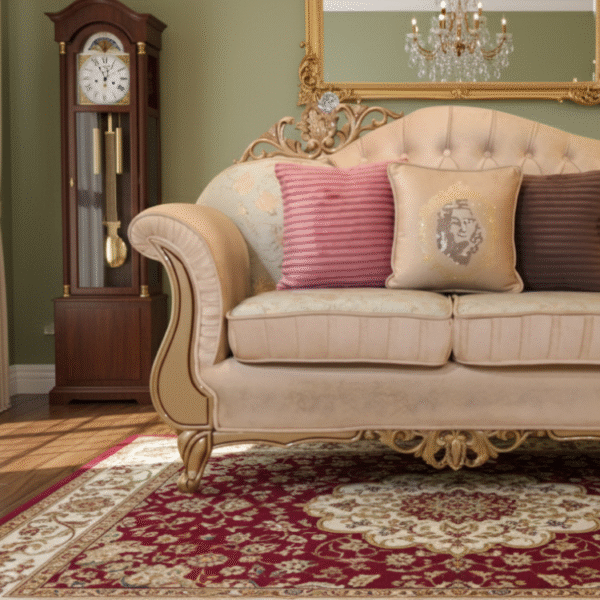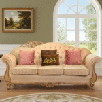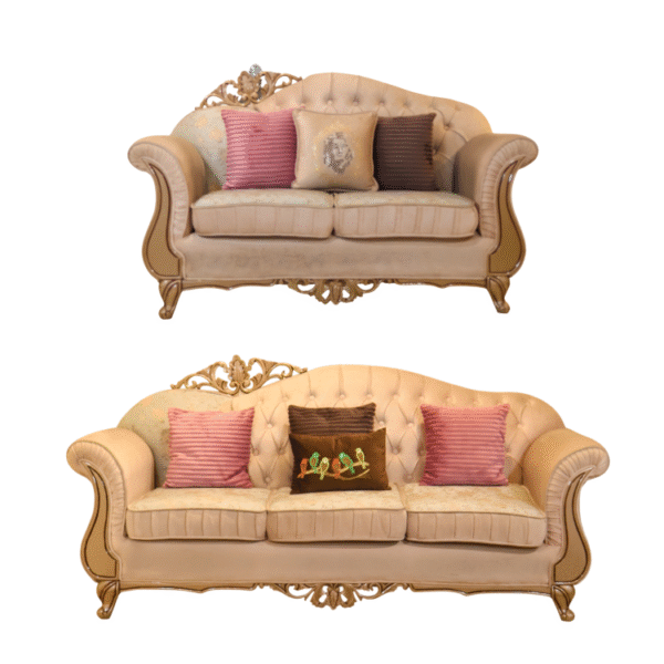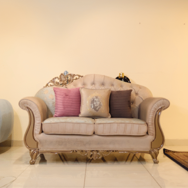 A beautifully crafted cream velvet sofa featuring elegant carved detailing, tufted backrest, and gracefully curved armrests. Paired with plush accent cushions, it brings a luxurious, vintage-inspired charm to any living space.
