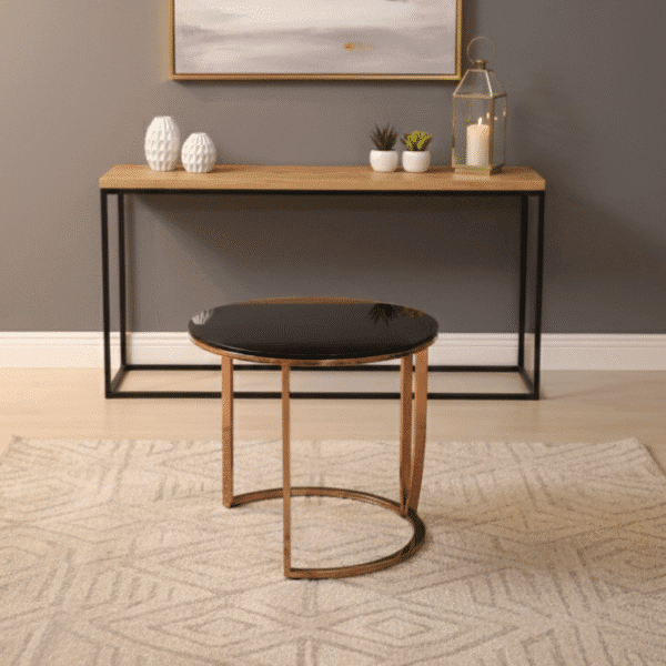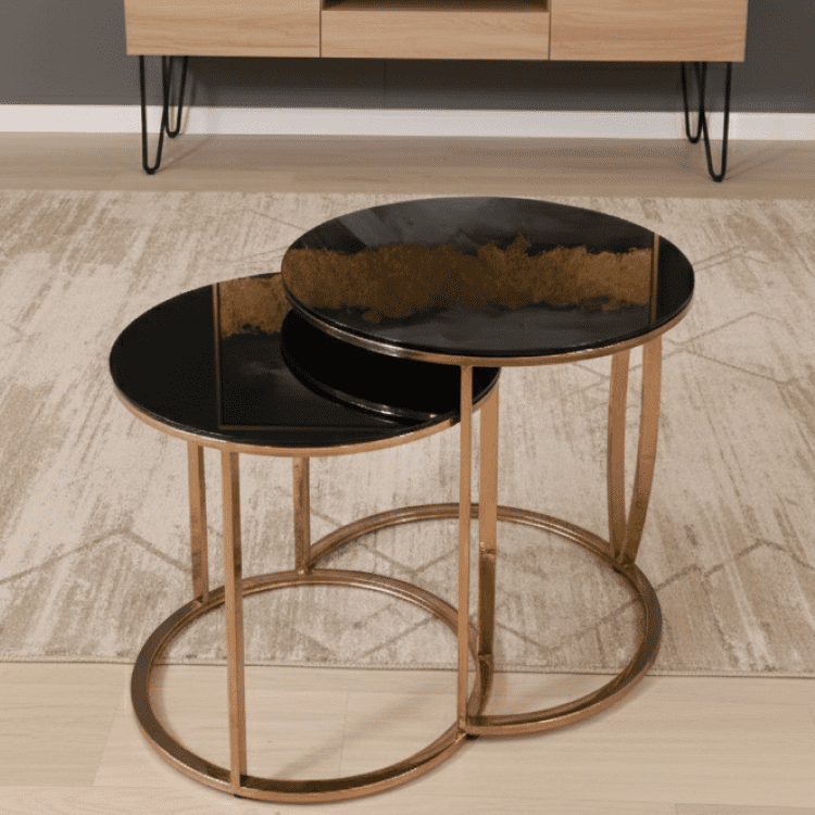 Obsidian Nest Tables combine sleek black glass tops with radiant gold frames in a space-saving nested design. A modern trio that adds layered elegance and functional versatility to living rooms, lounges, or entryways.