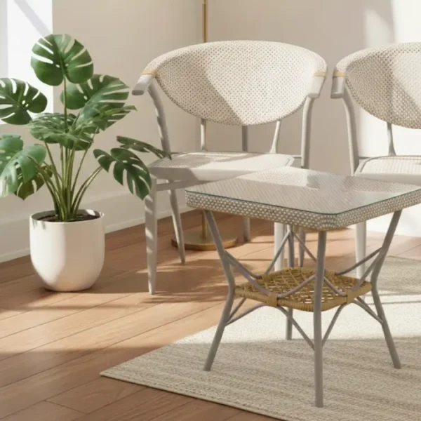 Enhance your outdoor area with this stylish Outdoor Wicker Dining set. This compact 3-piece bistro set features elegant white synthetic wicker chairs and a matching glass-top table, perfect for a garden, patio, or balcony setting. The set is built with a sturdy, rust-resistant frame and durable, all-weather wicker designed to withstand outdoor elements.