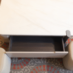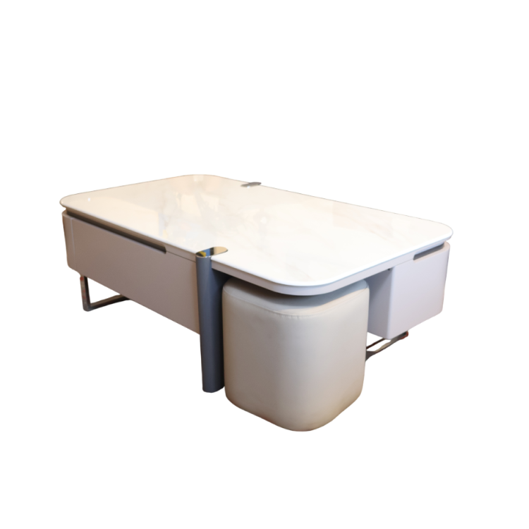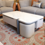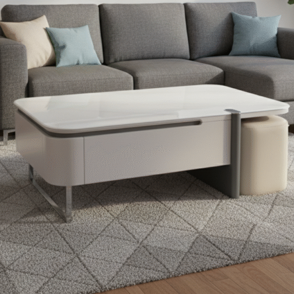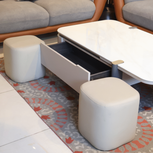 The Pearl Nest Table Set features a glossy white surface with built-in drawers and integrated beige ottomans. Its sleek, space-saving design pairs effortlessly with surrounding sofas, offering smart storage and versatile seating in modern interiors