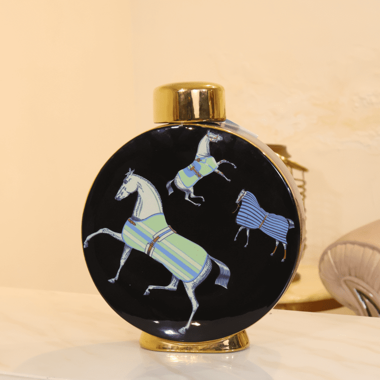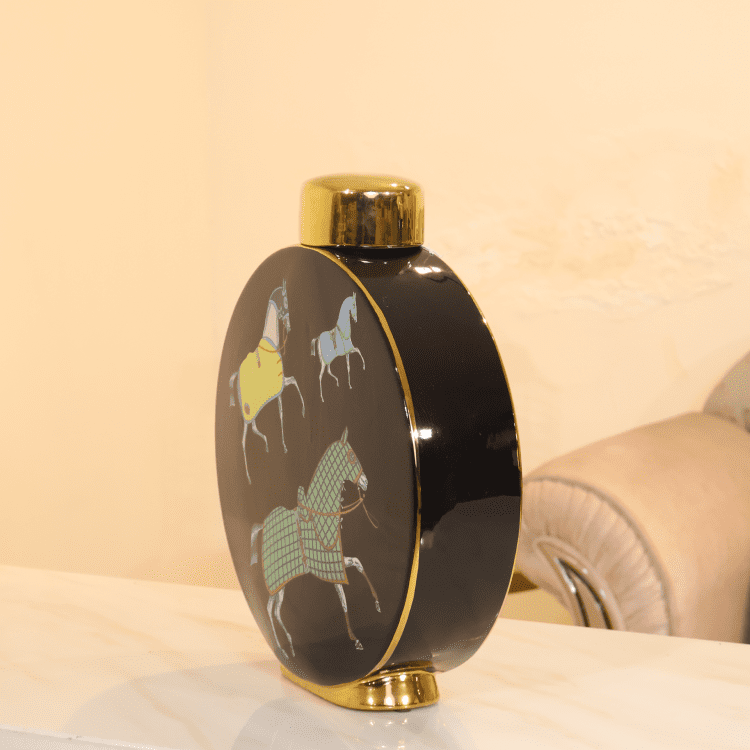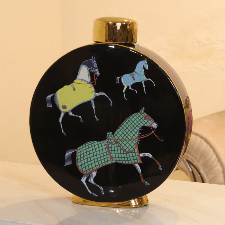 Regal Mane Vases showcase bold artistry with vibrant horse illustrations on a black base, accented by golden tops and bases. A striking decor set that blends cultural flair with modern elegance for curated interiors.