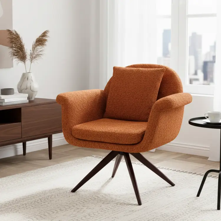 This imported Brookley armchair features orange-brown fabric leatherette upholstery and a sleek metal frame. Designed for comfort and style, it’s a modern accent piece ideal for living rooms, lounges, or executive spaces.