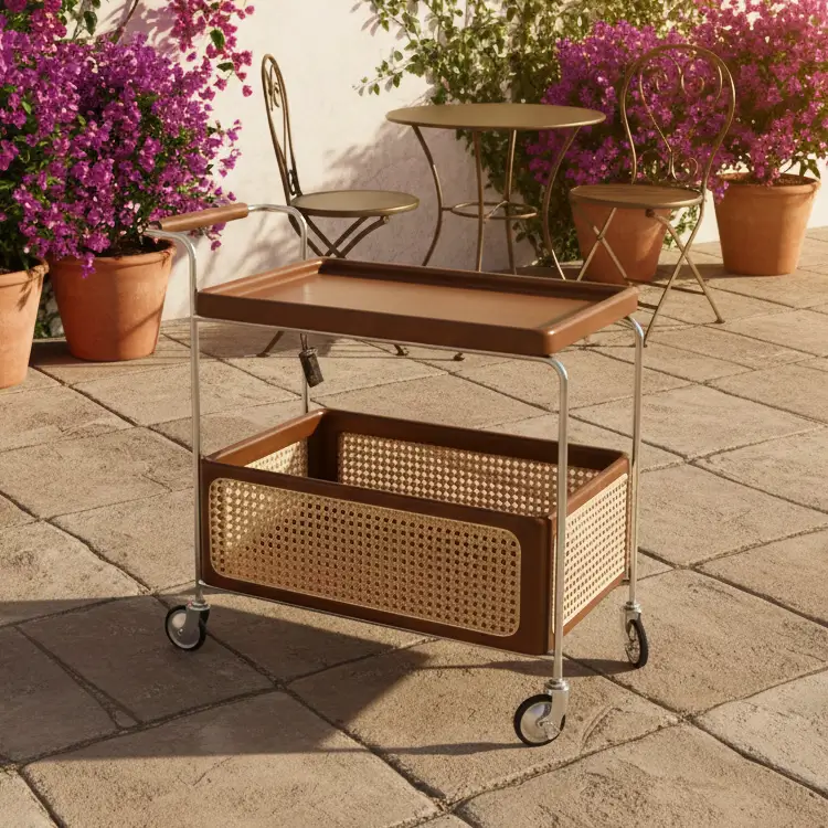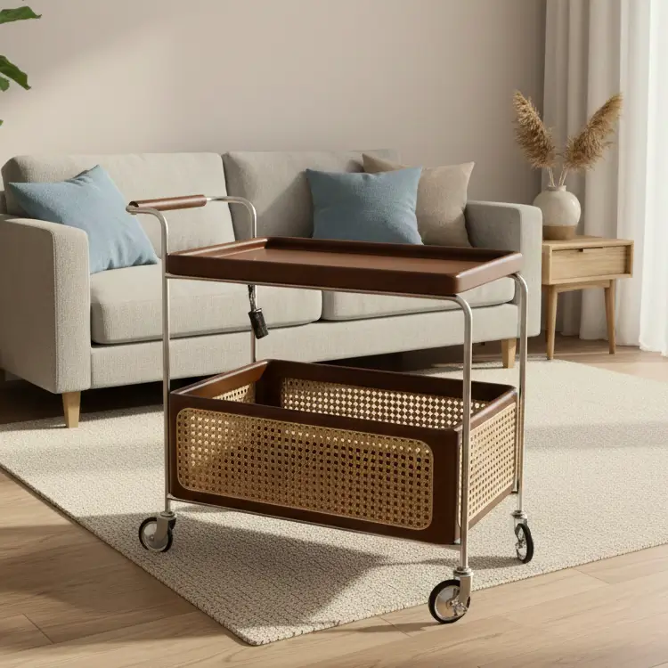The Rolling Refreshment Cart merges function with refined style. Crafted from rich wood and natural rattan, this mobile trolley offers stylish serving space for beverages, snacks, or magazines, making entertaining effortless in any room.