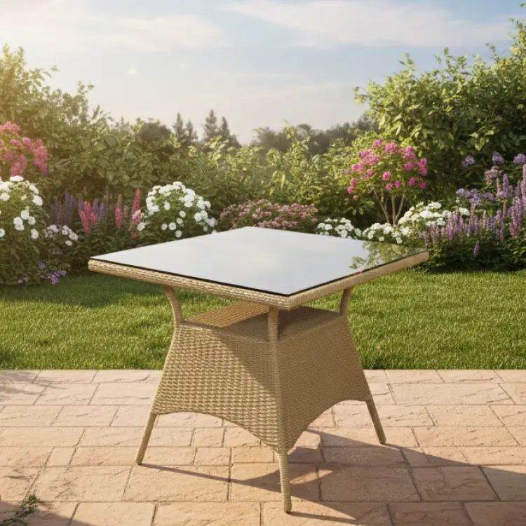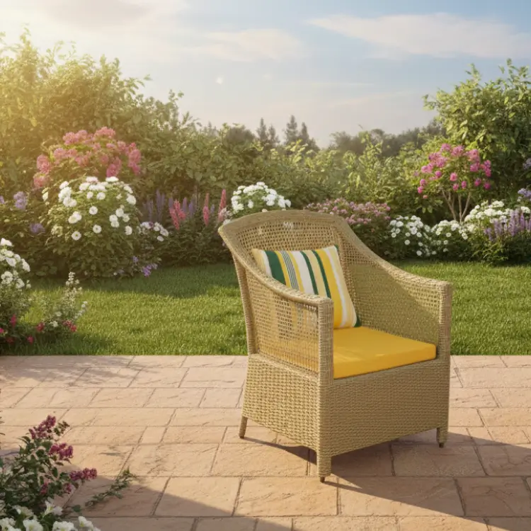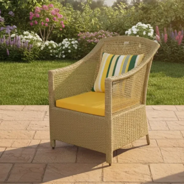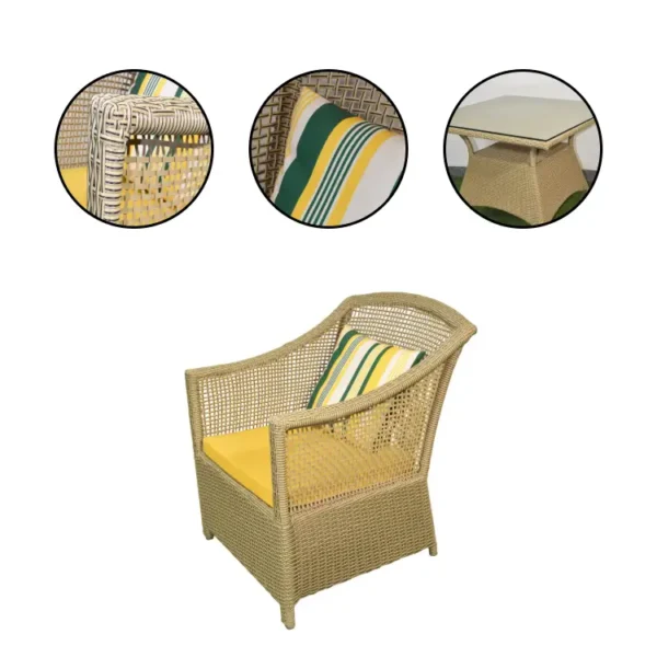 Enhance your patio or porch with the inviting Round-Back Outdoor Chair Set. This charming 3-piece collection features two generously sized chairs with classic woven backs and soft yellow cushions, paired with a sturdy square table topped with glass. Its traditional look and durable construction make it perfect for relaxing with a friend in your garden.