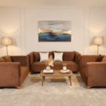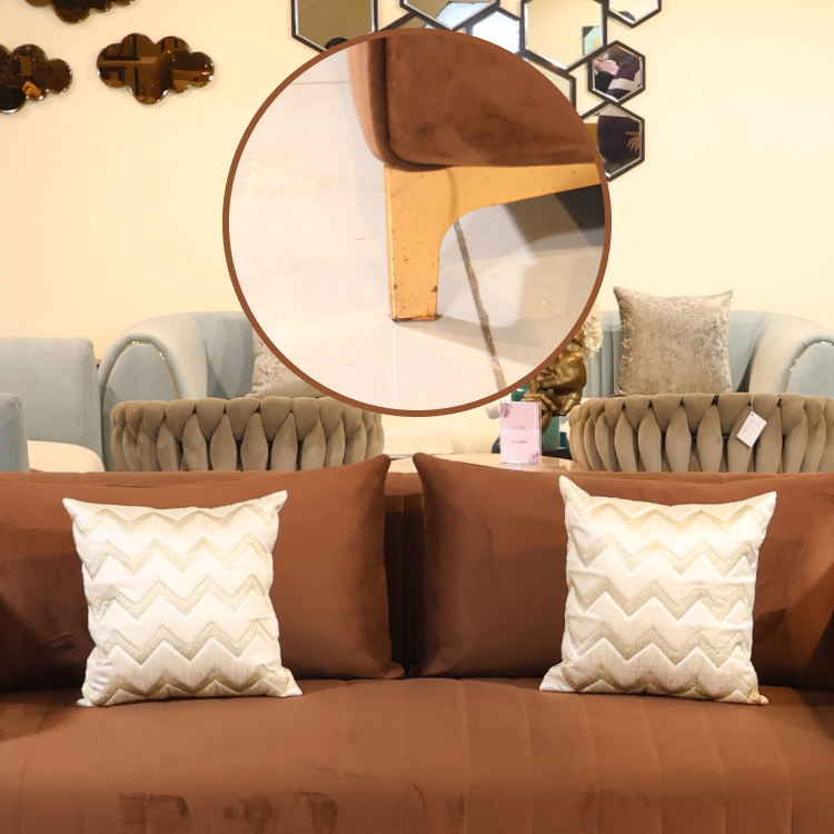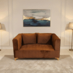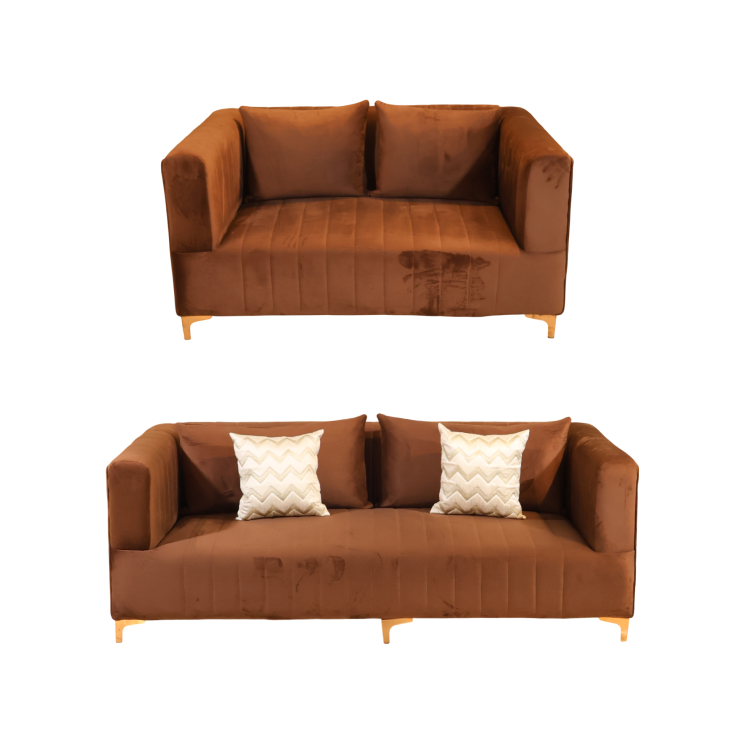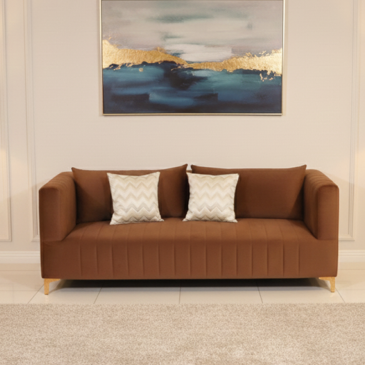 A sleek and contemporary rust sofa designed with clean lines and plush cushioning. Its soft velvet finish, wide armrests, and elegant gold legs create a stylish and comfortable centerpiece for any modern living space.