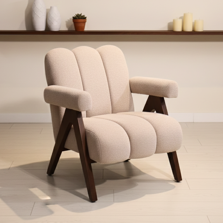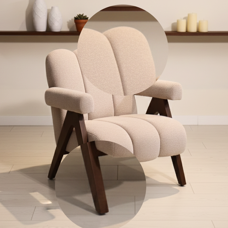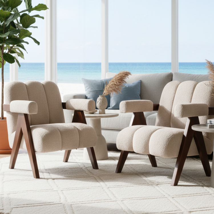The Sandwood Lounge Set features beige armchairs with wooden accents and a soft gray sofa. Paired with earthy pillows, abstract art, and pampas-filled vases, it creates a warm, modern retreat with natural harmony.