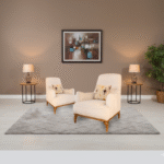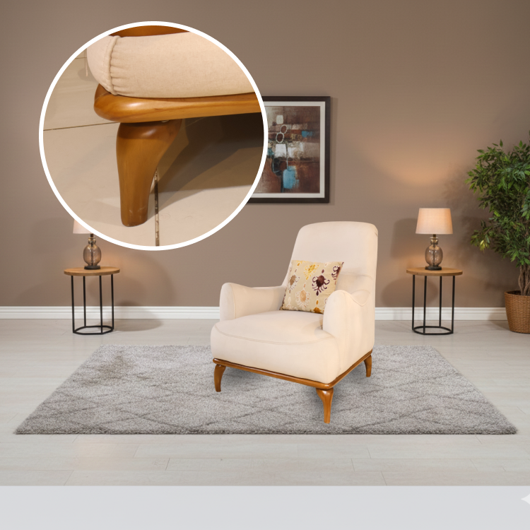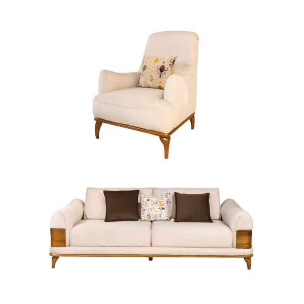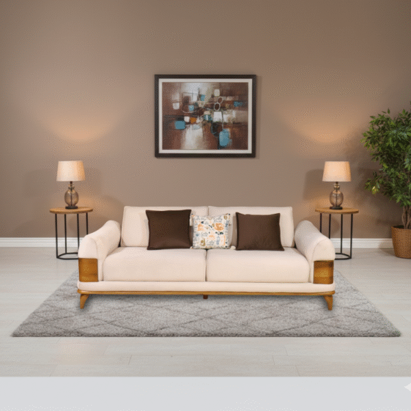Elevate your space with the Serene Ensemble Sofa—an inviting beige centerpiece with plush cushions and graceful symmetry. Paired with matching armchairs and soft lighting, it creates a perfectly balanced, tranquil living room retreat.