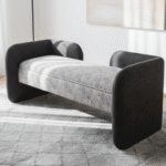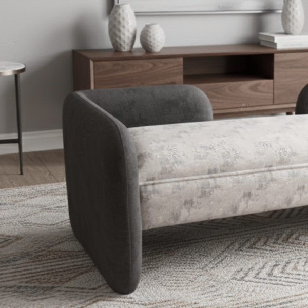 The Slate Teal Couch features soft gray upholstery with rounded armrests and teal accent pillows. Its minimalist form and textured finish bring calm sophistication to modern interiors, enhanced by abstract art and natural light.