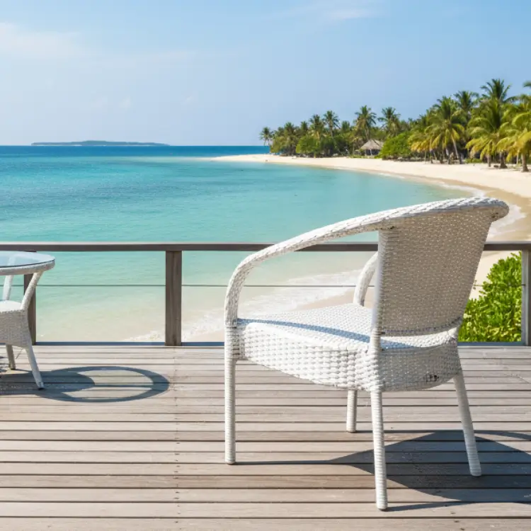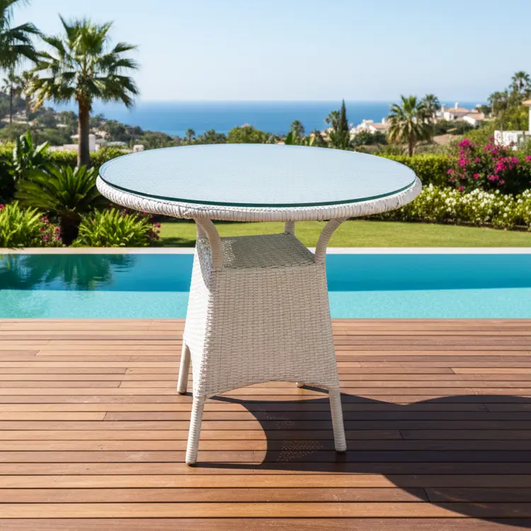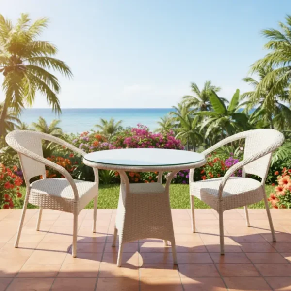 Maximize style in small spaces with the Slender Rattan Patio Dining Set. This elegant 3-piece set features a distinctive, vertically woven base on both the table and the high-backed chairs, creating a light, airy profile. With comfy cushions and a glass tabletop, it’s a chic and durable choice for sunrooms or balconies.