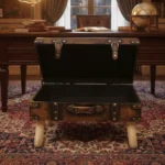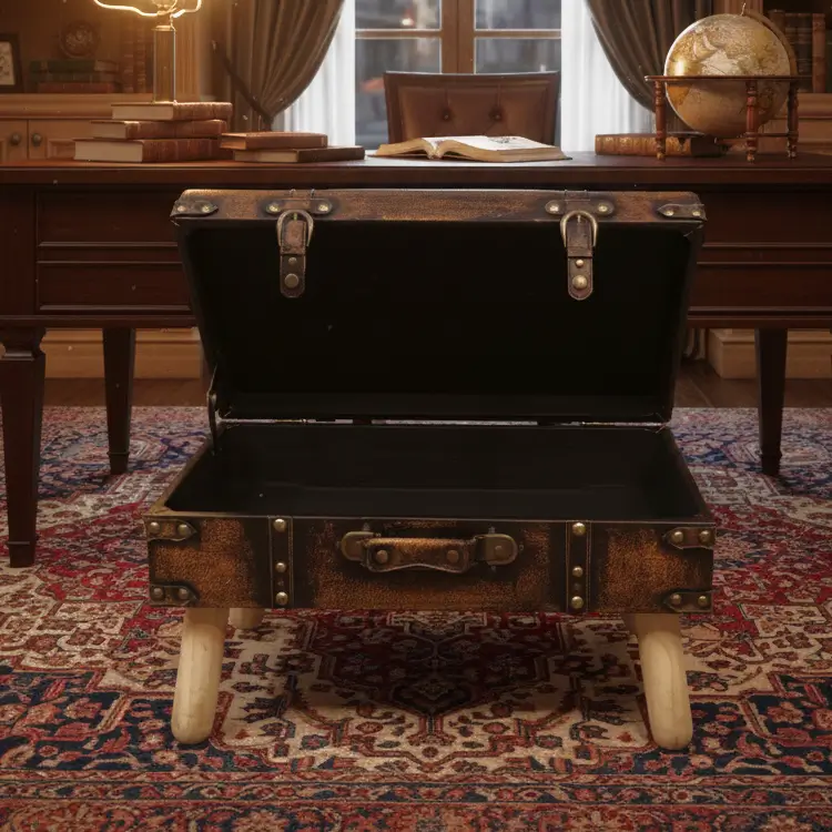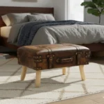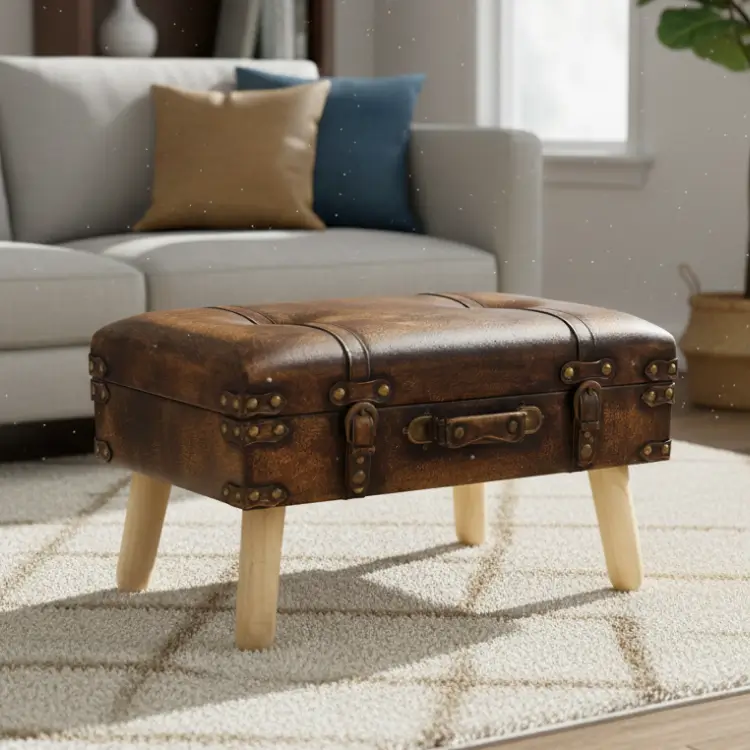This stylish storage stool features a vintage trunk design with fabric-leatherette upholstery and sturdy wooden legs. Functional and decorative, it offers hidden storage while adding nostalgic charm to bedrooms, entryways, or lounge areas.