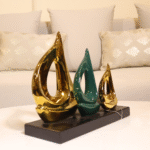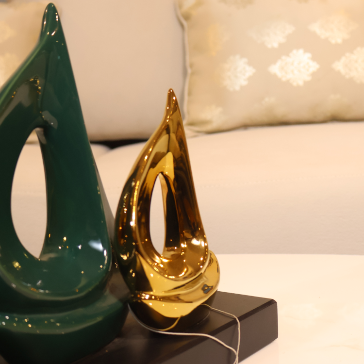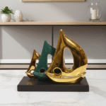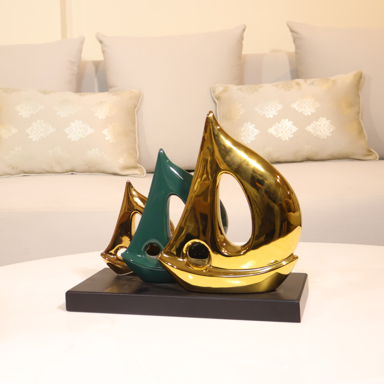 The Tricolor Drift Sculpture features abstract sailboats in gold, green, and bronze finishes, arranged on a sleek base. With cut-out sails and circular accents, it adds nautical elegance and metallic contrast to modern tabletops.
