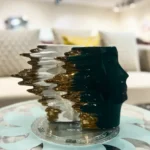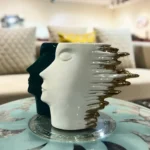 A decorative ceramic pot featuring two stylized faces in contrasting tones with golden accents. Ideal for dry arrangements or as a standalone art piece, it adds modern elegance to shelves, consoles, or tabletops.
