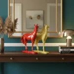 Glossy and bold, these red and yellow horse figurines bring dynamic flair to any console or mantel. Paired with a gold mirror and deep blue backdrop, they create a striking, modern decorative statement.