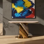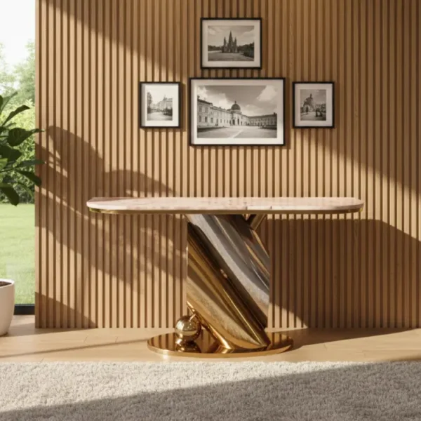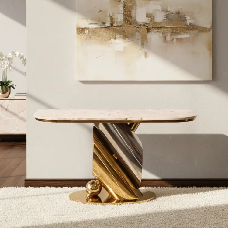 With a sculptural gold base and sleek marble top, the Twist Gold Console adds drama and elegance to modern interiors. Its twisted form and spherical accent create a striking silhouette beneath bold wall art.