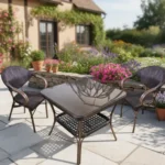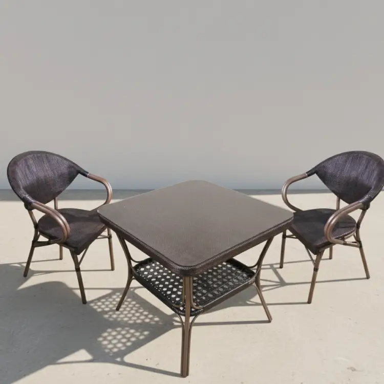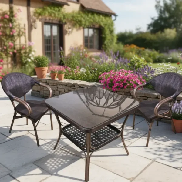 This elegant Wicker Patio Furniture set includes two durable, all-weather dark brown wicker chairs and a matching glass-top table. Perfect for your garden, patio, or balcony, it offers a chic and comfortable spot for outdoor relaxation and dining.